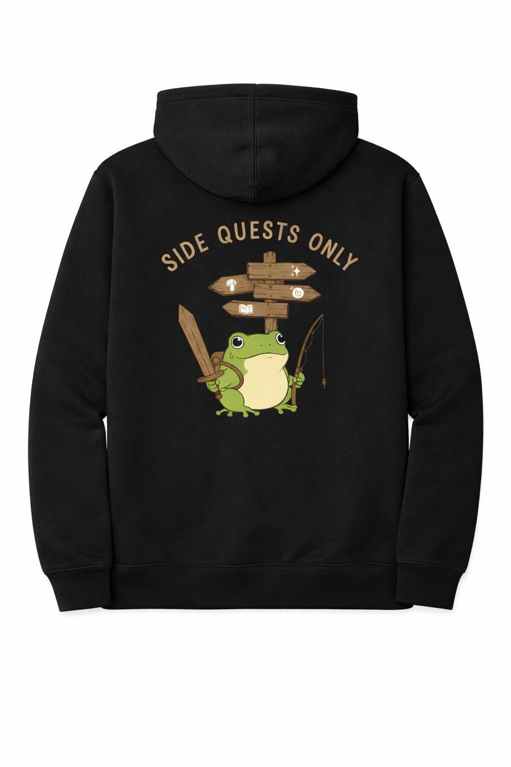 This cozy forest green hoodie features an adorable frog warrior standing at a crossroads — sword in one hand, fishing rod in the other, totally unbothered by whatever the main quest is doing. Because mushrooms, snails, and fishing are clearly more important.