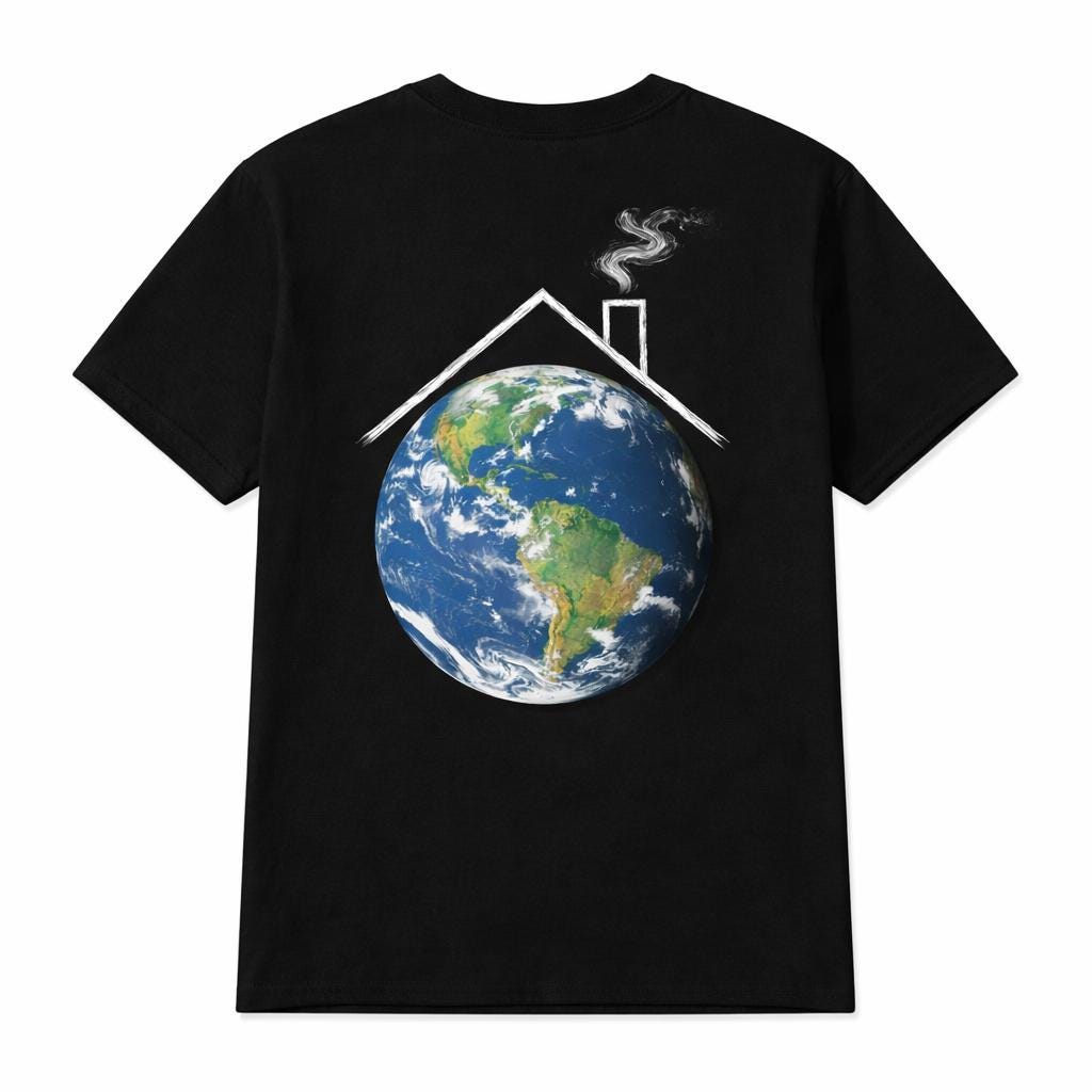 A minimalist yet powerful design that serves as a reminder that we all share the same roof. This tee features a high-definition Earth globe capped with a hand-sketched roofline and chimney, symbolizing the collective responsibility we have to the planet we call home.