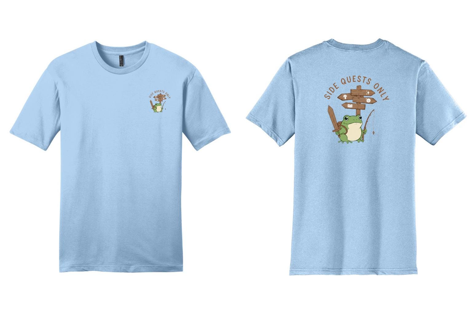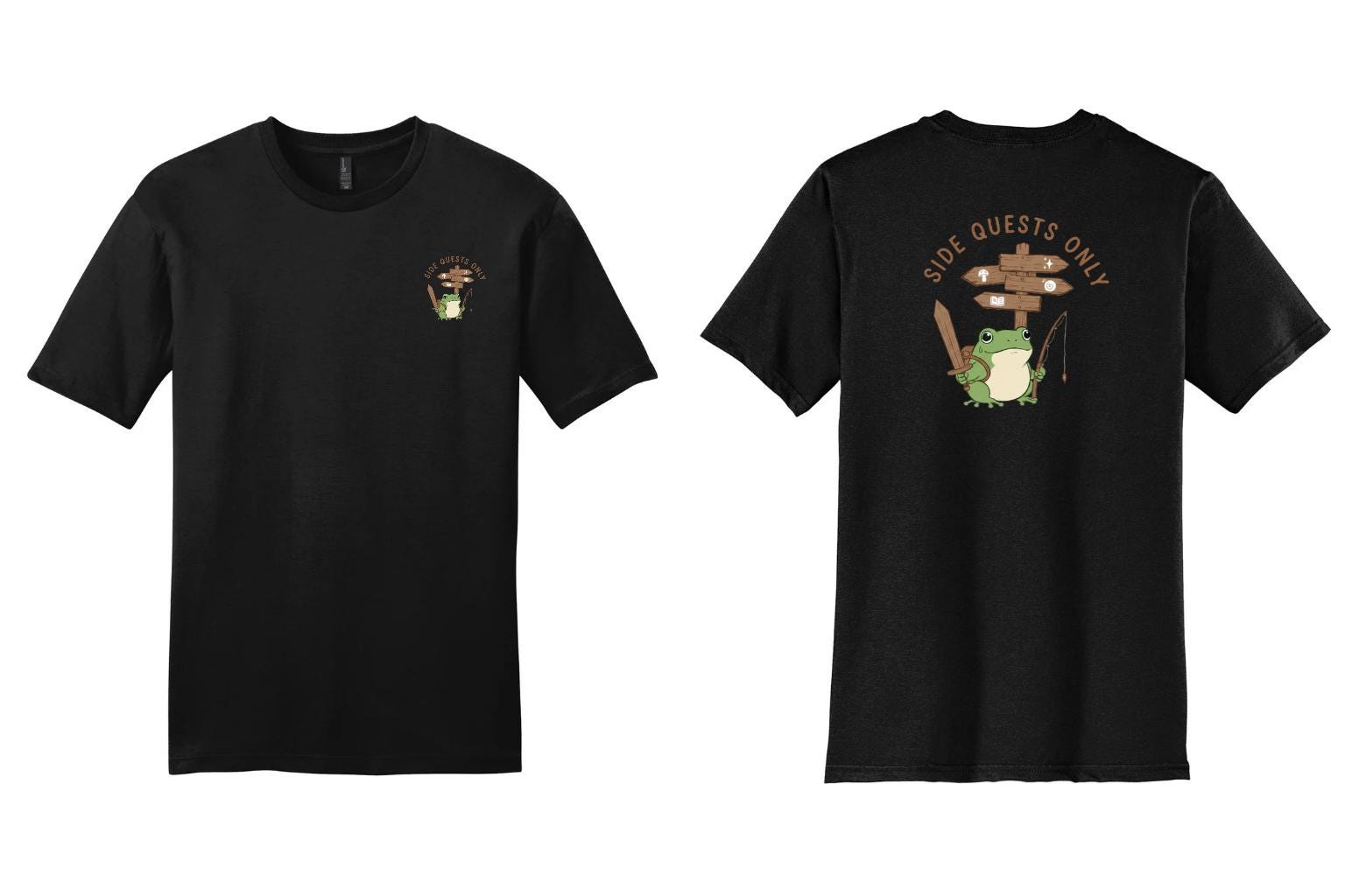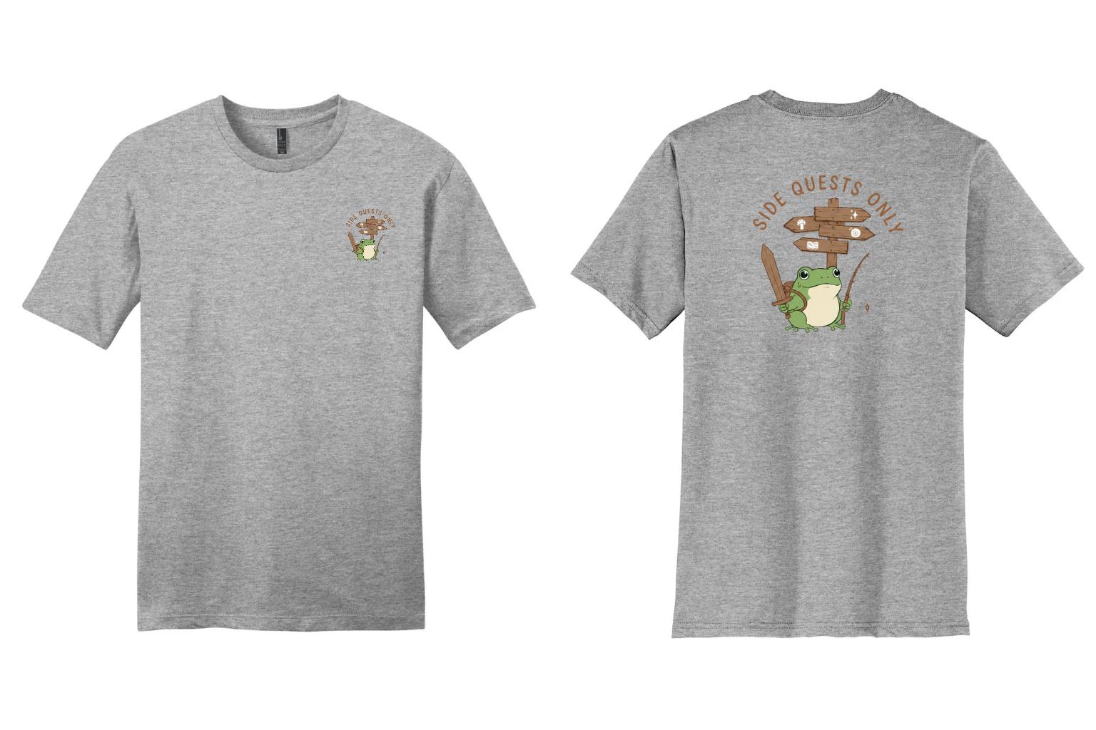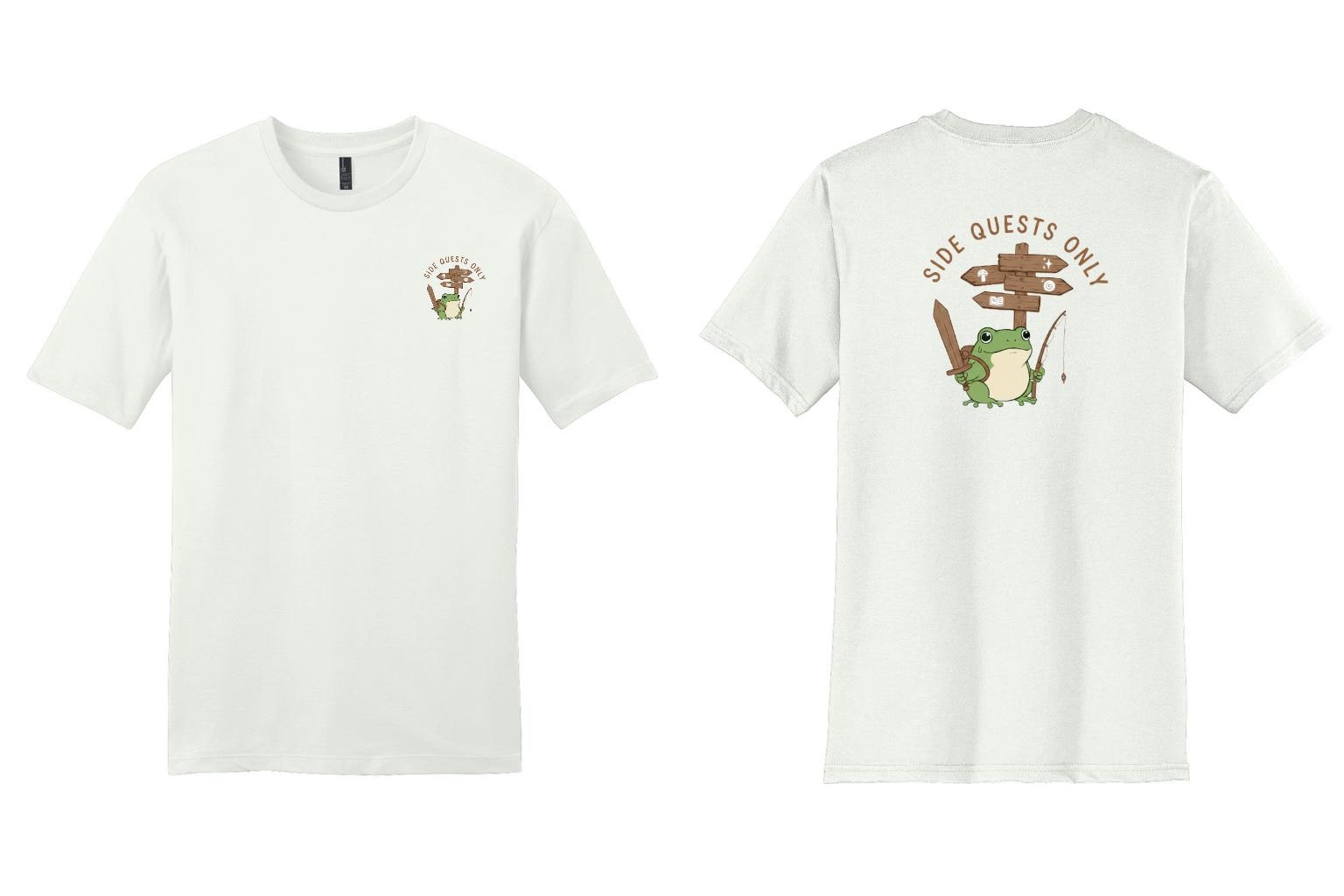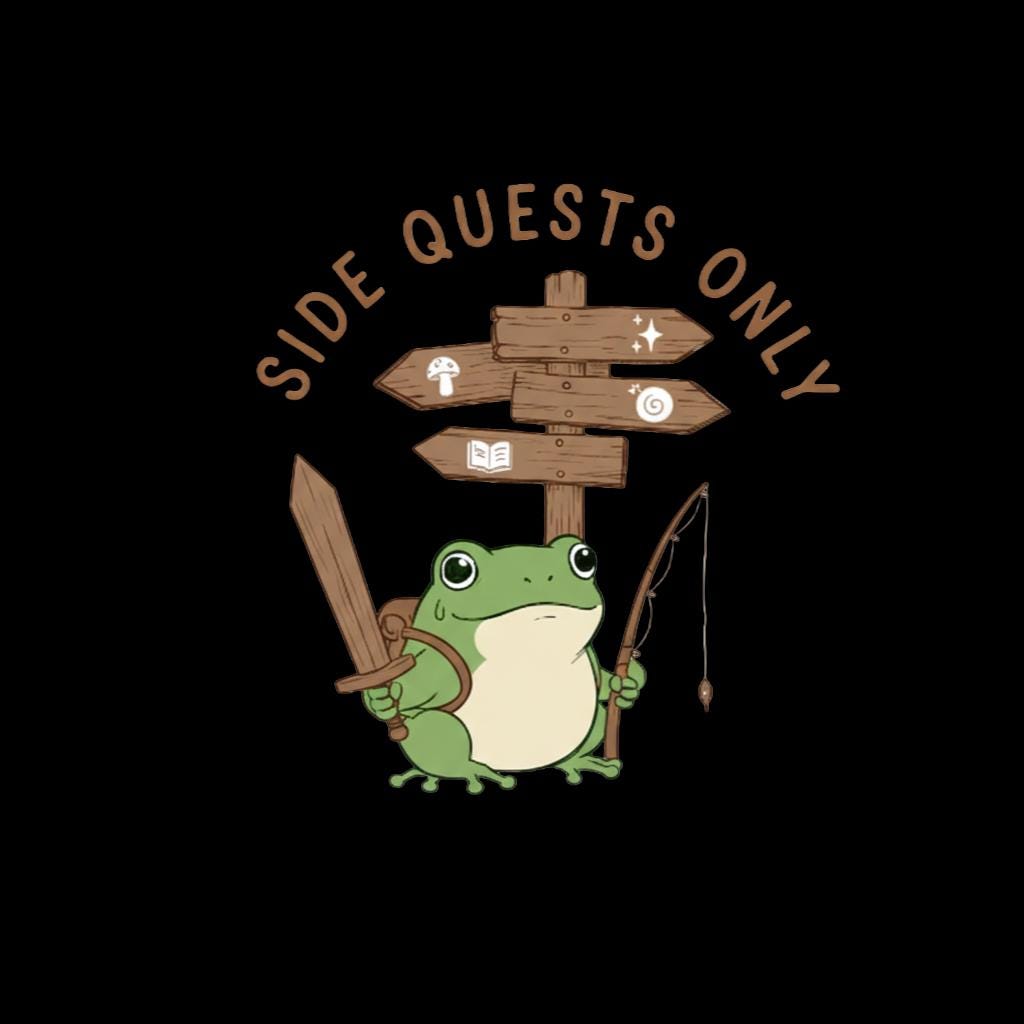 This “Side Quests Only” tee is made for gamers, adventurers, and anyone who prefers exploring over rushing the main storyline. Featuring a cute frog equipped for adventure, this design blends humor with cozy, wearable style.