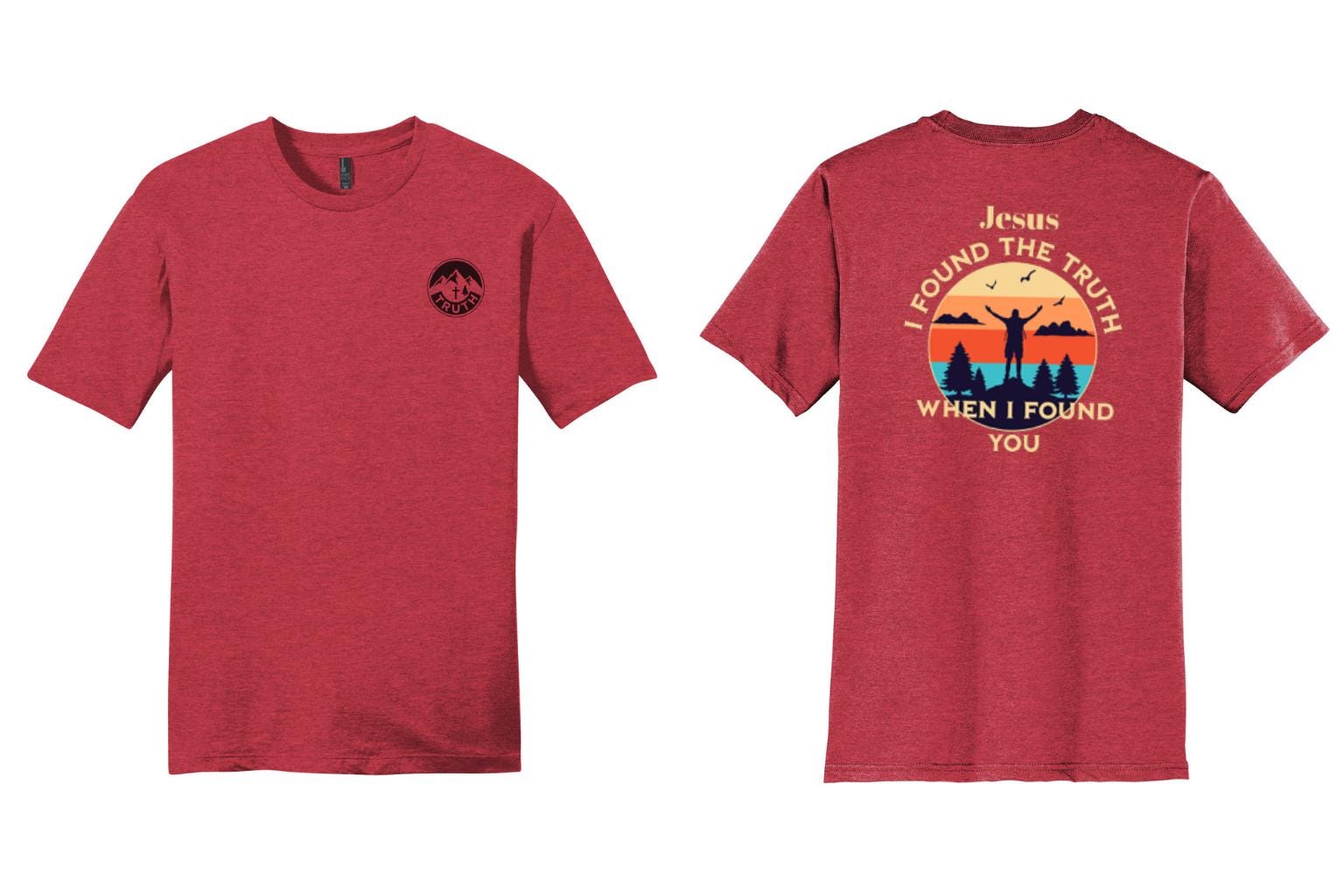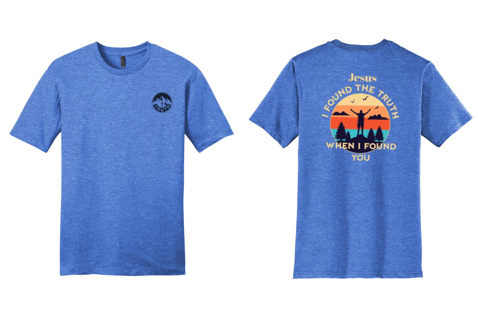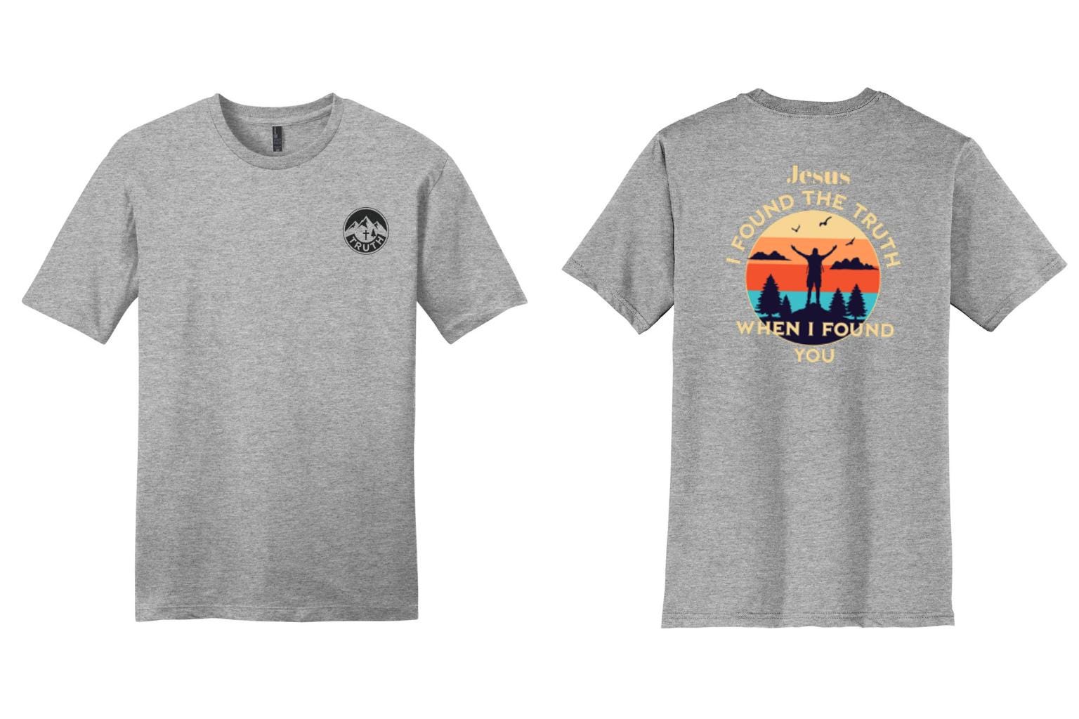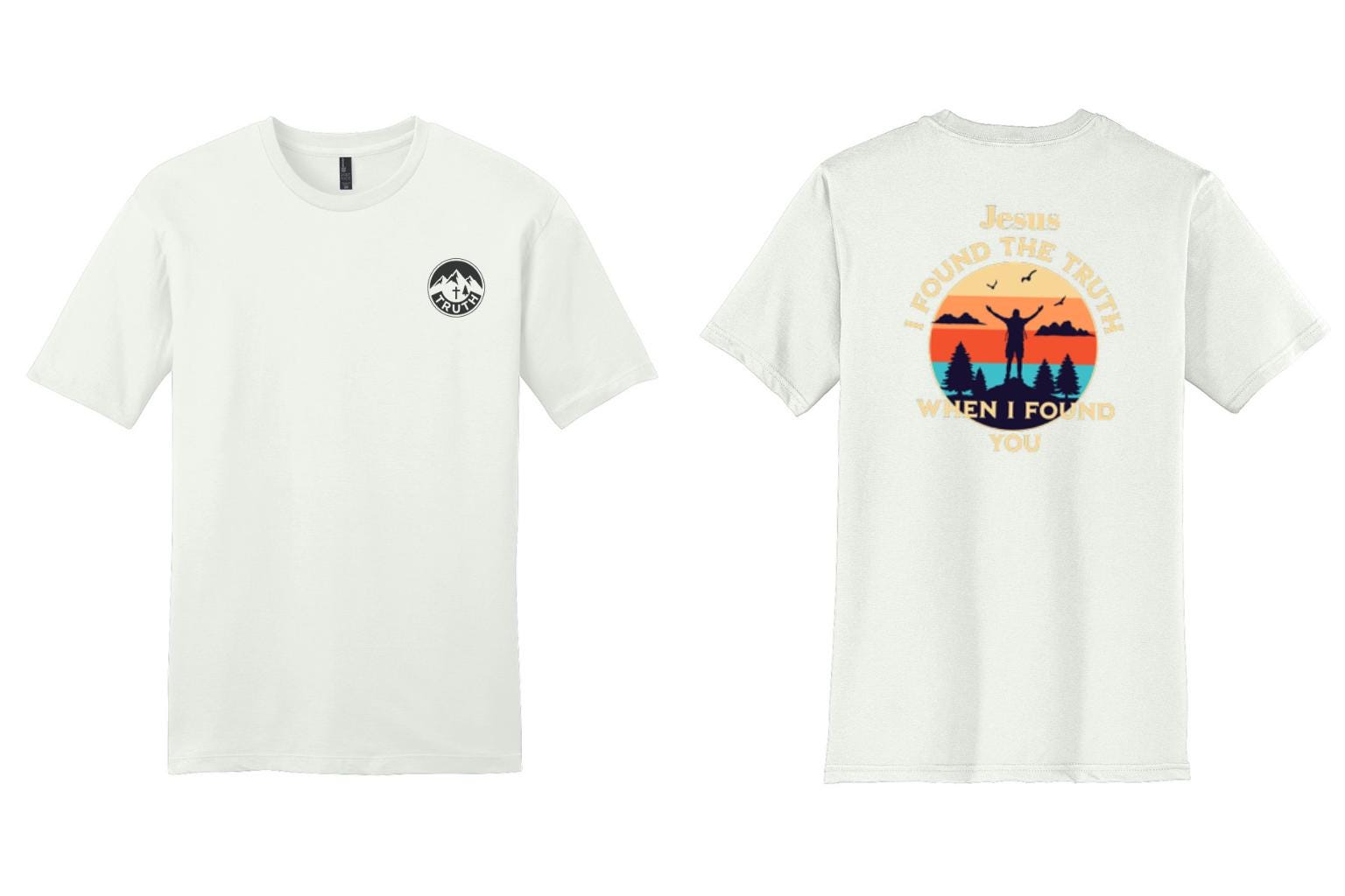 Statement Back Graphic: A vibrant, retro-inspired sunset silhouette centered around the message: "Jesus: I found the truth when I found you."